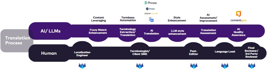 AI boosts translation speed and scope, yet humans are crucial for quality. Our mix of AI and human touch ensures that final products are precise and culturally fitting. This approach involves several key roles: