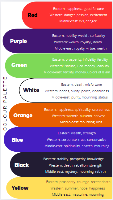 - Colors have different connotations (e.g., white means purity in the West but mourning in parts of Asia).