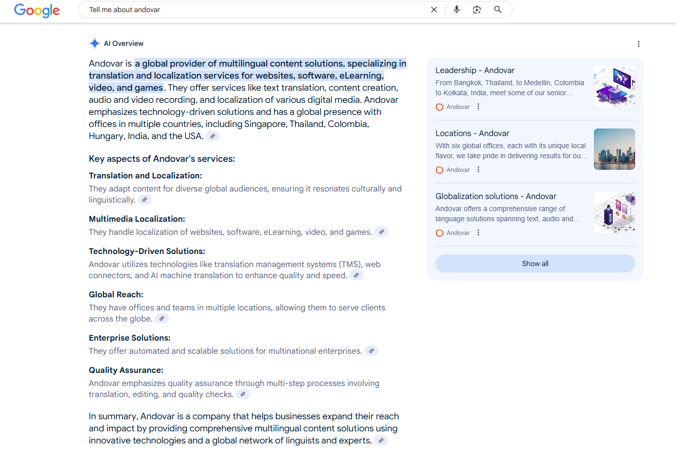 To get your website found, you need SEO, GEO practices, and paid ads. At Andovar, we use our website localization services to help you improve your online presence.