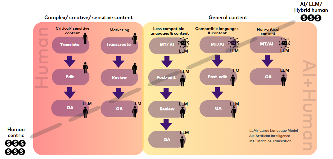 - Machine/AI Translation with Editing is used for quick turnaround and lots of content, like product descriptions. It adds a human touch to ensure quality and cultural fit.